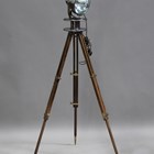 A mid-20th century patinated tin studio floor lamp, one side support detailed 'KNPS 55', raised on an adjustable tripod support, height 152cm, diameter of light 20cm.