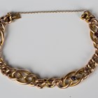 A gold curb and multiple link bracelet, mounted with two oval amethysts, on a snap clasp, indistinctly marked, fitted with a safety chain, weight 16.9g, length 19cm.
