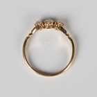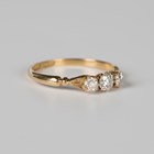 A gold and diamond three stone ring, claw set with a row of cushion cut diamonds between decorated shoulders, detailed 'C&H 18ct', weight 2g, ring size approx Q, with a case.