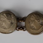 A silver and abalone shell oval panel link bracelet, detailed 'STG.SIL', on a hook shaped clasp, weight 26.7g, length 17.8cm, a lava cameo link bracelet, designed as a row of female classical portraits, length 18.5cm, and a set of six black glass buttons, with a case.