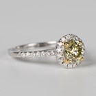 A white gold and diamond cluster ring, claw set with the principal circular cut fancy brownish greenish yellow diamond within a surround of circular cut diamonds, between diamond set seven stone shoulders, detailed 'K18', weight 4g, ring size approx M1/2, with a G.I.A. certificate stating the principal diamond weight 1.02ct, clarity grade I2, colour grade fancy brownish greenish yellow, with a case.