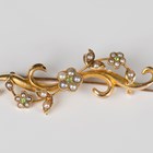 A gold, seed pearl and demantoid garnet brooch, designed as a scrolling foliate, detailed '15ct', weight 2.3g, width 4.4cm.