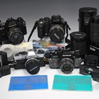 A collection of cameras, lenses and accessories, including an Olympus OM40 Program with Auto-S 1:1.8 f=50mm lens, an Olympus OM10 with Auto-S 1:1.8 50mm lens, a Chinon CE-4 with Chinon 1:3.5-4.5 f=28-50mm lens, a Fuji Finepix S9600 digital camera with Fujinon zoom f=6.2-66.7mm lens, a Sigma 1:3.5 f=80-200mm zoom lens, cased, and a Vivitar 28-200mm zoom lens.