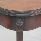 A George III mahogany tea table with hinged top, the frieze decorated with stiff leaf sprays and rosettes, on square tapering legs and castors, height 72cm, width 91cm, depth 46cm.