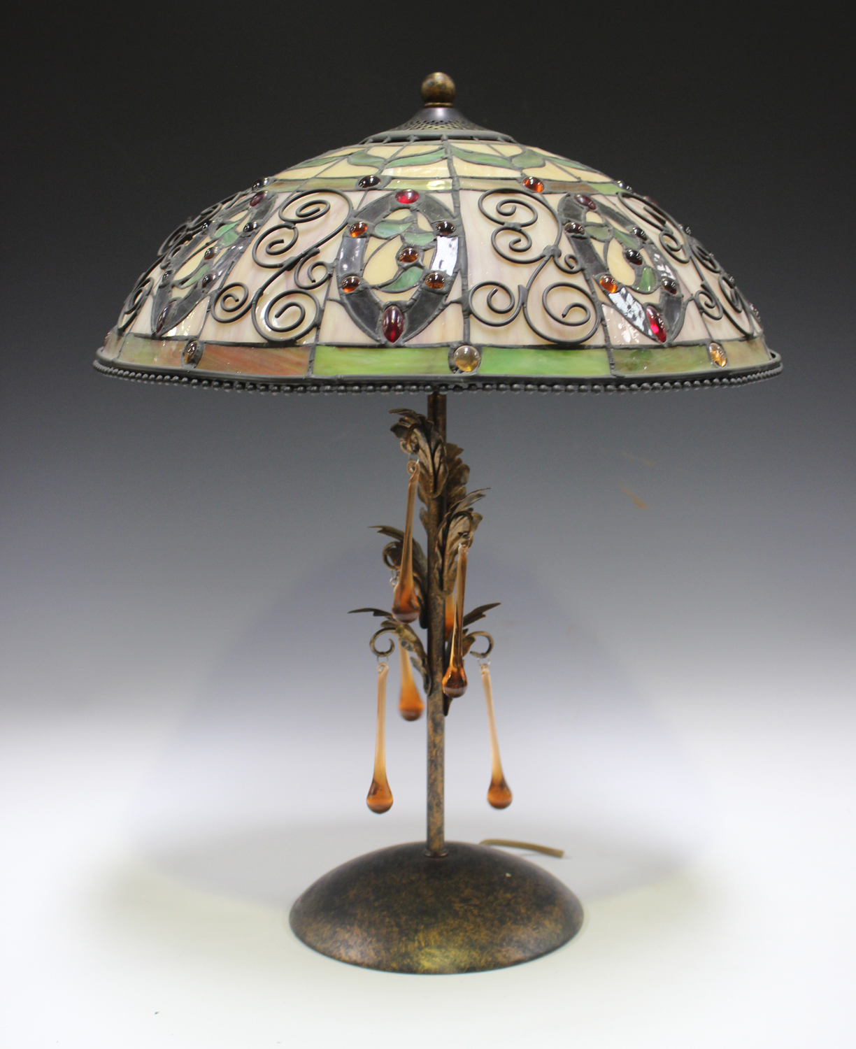 A modern bronzed metal table lamp with a Tiffany style stained glass shade, the foliate stem hung with amber glass drops, height 53cm.