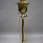 An Edwardian brass telescopic lamp standard, later converted to electricity and fitted with a Tiffany style leaded and stained glass shade, height 155cm.