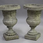 A pair of late 20th century cast composition stone garden urns of half-reeded campana form, height 61cm, diameter 41cm.