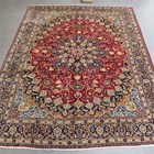 An Esfahan carpet, Central Persia, mid/late 20th century, the red field with a flowerhead medallion, within a midnight blue palmette and scroll border, 382cm x 290cm.