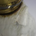 A French porcelain oil lamp base in the form of an owl, early 20th century, the white glazed owl with glass eyes, on a naturalistic base, with glass chimney and frosted glass shade, retailer's mark for 'William Whitely' to base, total height 50cm (faults).
