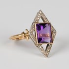 A French gold, amethyst and diamond ring, collet set with the square cut amethyst within an openwork lozenge shaped surround, set with rose cut diamonds, French eagle mark to shank, weight 3.8g, ring size approx O.