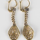 A pair of diamond pendant earrings, each drop of pierced openwork design, set below a row of seven circular cut diamonds, with post and folding fittings, length 3.9cm.