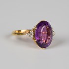 A gold ring, claw set with an oval cut amethyst between diamond set three stone shoulders, detailed '18ct', weight 6.1g, ring size approx R1/2.