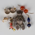 A pair of 9ct gold earrings, each in a curved design with foliate engraved decoration, London 1986, weight 3.8g, length 1.4cm, a pair of cornelian single stone earstuds, two odd earrings, a silver brooch, designed as a teddy bear wearing a marcasite set bow, detailed '925', weight 20.6g, and a costume brooch, designed as a mouse.