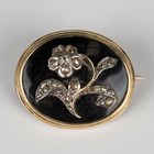 An early Victorian rose cut diamond oval mourning brooch, circa 1850, the centre with an applied forget-me-knot spray motif on a black ground, width 2.9cm.