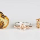 A gold and pale blue gem set solitaire ring, detailed '14K', weight 6.8g, ring size approx P1/2, a gold, silver and champagne cubic zirconia solitaire ring, detailed 'T. Plodowski 925S 585', weight 8.1g, ring size approx N1/2, and a silver gilt and amber ring, detailed '925'.