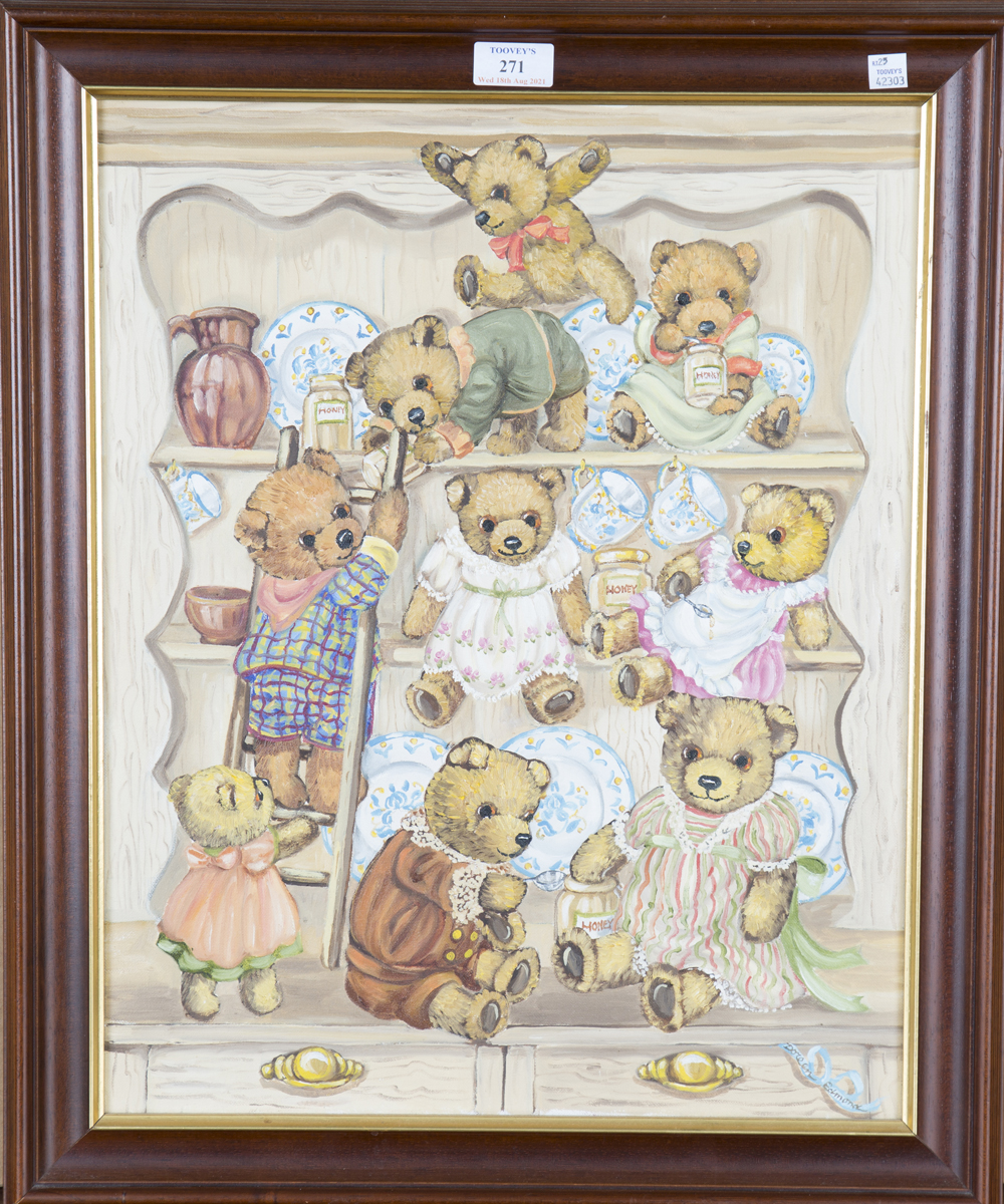 Doreen Edmond - A Group of Teddy Bears consuming Honey on a Dresser, 20th century oil on canvas, signed, 49.5cm x 39.5cm, within a stained wood frame.