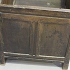 A late 17th century panelled oak coffer with later carved decoration, raised on stile supports, height 62cm, width 119cm, depth 59cm (alterations).