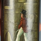 An early 19th century papier-mâché vesta case, the front painted with a drunk man urinating in the street, length 6cm, together with a 19th century glass needle sleeve decorated with the International Exhibition 1862, a small silver model of a plane and a Tartan ware 'Lay of the Last Minstrel' book.