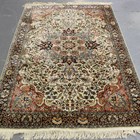 A Kashmir part silk rug, mid/late 20th century, the ivory field with a flowerhead medallion, within a charcoal palmette and vine border, 224cm x 146cm.