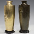 A pair of Japanese mixed metal inlaid bronze vases, Meiji period, each shouldered tapering body inlaid with a cockerel perched in blossoming prunus branches, each with incised signature to side, height 18.3cm, each with hardwood stand (one polished, the other with small dent to shoulder).