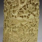 A pair of Chinese ivory tusk vases, late 19th century, each carved in relief with precious objects, birds, flowers and prunus, height 22.8cm (one with repaired base).
