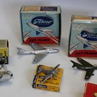 Six Tekno diecast aircraft, comprising a No. 786 MIG 15, a No. 785 Hawker Hunter, a No. 788 Super Mystere and a No. 787 Super Sabre, all boxed, a No. 403 DSB-1 and a No. 402 BB-1, both unboxed, together with a Tekno No. 926 Jaguar 'E' Type, boxed, a No. 442 scooter, a No. 443 scooter and sidecar and a Schuco Piccolo No. 784 Junkers Ju 52 aircraft, boxed (some paint chips and playwear, boxes creased, torn and scuffed).