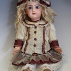 A Tete Jumeau bisque head doll, impressed '6' and printed 'Depose Tete Jumeau 6' in red, with later blonde wig, cork pate, pierced ears, blue glass eyes, painted eyebrows and lashes, open/closed mouth and jointed composition body with blue Jumeau mark to back, height 39cm, wearing a lace-edged cream and burgundy dress, undergarments, socks and shoes (marks to back of head, some paint wear to body).