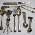 A set of nine Victorian silver teaspoons with pierced floral and scroll terminals, and a matching pair of sugar tongs, London 1894 by William Comyns & Sons, a set of five silver coffee spoons with heart shaped bowls and twin golf club and golf ball handles, Birmingham 1895 by S. Blanckensee & Son Ltd, and a group of other silver cutlery, including condiment spoons, total weight 428g.
