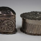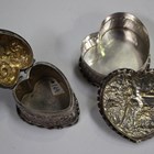 A late Victorian silver heart shaped box and cover, embossed with figures in a rural scene, London 1889 by Army & Navy Cooperative Society Ltd, length 6cm, and a silver heart shaped box with hinged lid, embossed with scrolls, Birmingham 1890 by Nathan & Hayes, length 5cm, total weight 88.7g.