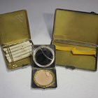 A George V silver engine turned rectangular cigarette case, Birmingham 1936 by Mayes, Mills & Co, length 12cm, a similar silver square cigarette case, Birmingham 1932 by William Neale & Son, total weight 227g, width 8.2cm, and a small square engine turned powder compact, Birmingham 1937 by Crisford & Norris Ltd, width 5.5cm.