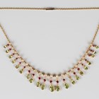 A gold, half-pearl, ruby and peridot fringe necklace, late 19th/early 20th century, the front with a row of twenty-one tassel drops, unmarked, weight 13g, length 39cm (one ruby missing), with a Harvey & Gore leather case.