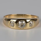 A gold and diamond three stone ring, gypsy set with cushion cut diamonds, detailed '18ct', weight 7g, ring size approx W.