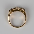 A gold ring, mounted with a row of three principal cushion cut diamonds, the principal diamond mounted at the centre, further set with two pairs of smaller cushion cut diamonds, the mount decorated with scroll pierced sides, weight 4.6g, detailed '18 West & Son', ring size approx M.
