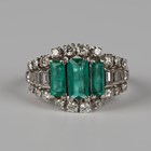 An emerald and diamond ring, claw set with the three principal graduated baguette cut emeralds between graduating baguette cut diamonds set sides within a surround of circular cut diamonds, ring size approx N, with an associated case.