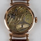 A Patek Philippe & Co pocket watch movement and dial, the jewelled gilt movement detailed 'Patek Philippe & Cie, No 34121 Geneve' the signed circular enamel dial with black Roman hour numerals, outer Arabic minutes and subsidiary seconds, later converted to a wristwatch with gold circular case, detailed '585', case diameter 4.6cm, on a brown leather strap.