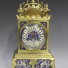 A late 19th century French brass and enamelled porcelain mounted mantel clock with eight day movement striking on a bell, the blue ground circular dial with white roundel Roman hours and polychrome foliate scroll centre, the rectangular case with domed and scroll surmount above reeded finials and bevelled glass side panels, the square base inset with polychrome decorated blue ground panels, on circular feet, height 34cm, with key and pendulum.