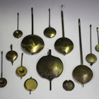 A collection of thirteen brass clock pendulums of various sizes, together with a group of eleven wooden handled longcase clock winding keys.