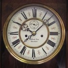 A late 19th century walnut Vienna style wall clock with eight day movement striking on a gong, the two piece dial with Roman hour numerals and subsidiary seconds and detailed 'Alfred Lea Abedare', the case with mask surmount above fluted columns and glazed door, height 120cm, with pendulum and two brass weights.
