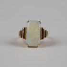 A gold ring, claw set with a cut cornered rectangular opal between stepped shoulders, detailed '14K', weight 5.4g, ring size approx J.