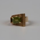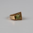 A gold ring of abstract design, mounted with a cut cornered rectangular step cut peridot, weight 7.3g, detailed '14K', ring size approx J.