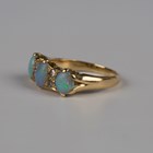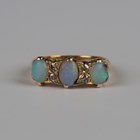 A gold, opal and diamond ring, mounted with three oval opals alternating with two pairs of cushion cut diamonds at intervals, unmarked, weight 4.6g, ring size approx M.