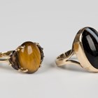 A 9ct gold ring, claw set with an oval cabochon tiger's eye between two crescent shaped smoky quartz, weight 3.6g, ring size approx P, and a gold ring, collet set with an oval banded agate between split shoulders, unmarked, weight 4.8g, ring size approx M.
