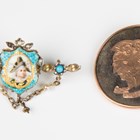 An enamelled brooch, circa 1910, probably French, the central shield shaped motif decorated with the portrait of a child, width 3.7cm, a 9ct gold mounted tortoiseshell brooch, decorated with the badge of the 'Artists Rifles', London 1916, weight 2.5g (the pin lacking), a gilt metal mounted oval shell cameo brooch, another brooch, a paste set bracelet and four stickpins.