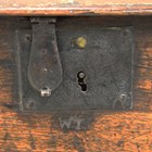 A late 17th century oak six-plank coffer, the hinged lid above a steal lockplate and incised initials 'W.T.', height 50cm, width 74cm, depth 32cm.