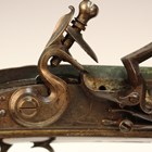 A late 18th/early 19th century flintlock pistol by Galton with part-octagonal moulded barrel, barrel length 22.5cm, line border engraved lockplate, swan neck hammer and scrolling frizzen, full-stocked with engraved brass trigger guard and later horn-tipped ramrod.