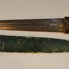 A 19th century Russian kindjal with straight double-edged blade with double fullers, blade length 33.5cm, terminating with engraved and gilt metal damascened panels depicting a bird and a lion, and brass mounted rhino horn handle, with green stained leather mounted wooden sheath. Note: as this lot incorporates rhinoceros horn, it would be very unlikely that a re-export certificate would be granted beyond the UK. Customers outside the UK are requested NOT to bid on this item.