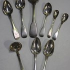 A Victorian Scottish silver King's pattern sauce ladle, Edinburgh 1851 by Mackay & Chisholm, length 15.5cm, a pair of Irish silver Fiddle pattern dessert spoons, Dublin 1808 by J.D., length 17cm, and a group of other Scottish and Irish silver Fiddle pattern spoons, including a tablespoon, Dublin 1832 by James Brady, total weight 268.3g.