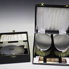 A pair of Elizabeth II silver backed hairbrushes and matching comb, each with engine turned decoration, London 1969, cased, together with a silver backed hairbrush and comb, Birmingham 1977, cased.