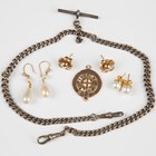 A 9ct gold and enamelled fob medal, Birmingham 1922, a pair of cultured pearl earstuds, a pair of imitation pearl drop shaped pendant earrings, a pair of 9ct gold earstuds with central bead motifs and a silver curblink watch Albert chain, fitted with two swivels and a silver T-bar, 9ct gold weight only 8.4g.