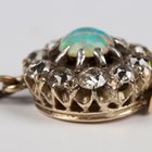A single row necklace of graduated pearls, possibly natural saltwater, on a gold, opal and diamond cluster clasp, claw set with the principal circular opal within a surround of ten circular cushion shaped diamonds, total length 53.5cm, smallest pearl diameter 0.3cm, largest pearl diameter 0.6cm.